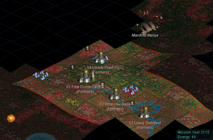 But there is a workaround: it's very possible to edit base SMAC to use the Free Drones faction. This wouldn't work right for all factions, particularly the Pirates and obviously the aliens, but does for this one. The one-less-drone ability doesn't exist in the base game, but can be virtually replicated with the Peacekeepers' talent ability instead, which will function identically through the parts that matter (more details later.) To include a new faction in alpha.txt requires replacing one of the original seven, for which the obvious target is the Hive as the most similar and also occupying the same faction slot in SMAC as the Free Drones do in SMAX (this matters for the missing-tech mechanic.) Finally, the Free Drones are the one expansion faction I actually like ideologically, with a strong conviction distinct from the first seven.