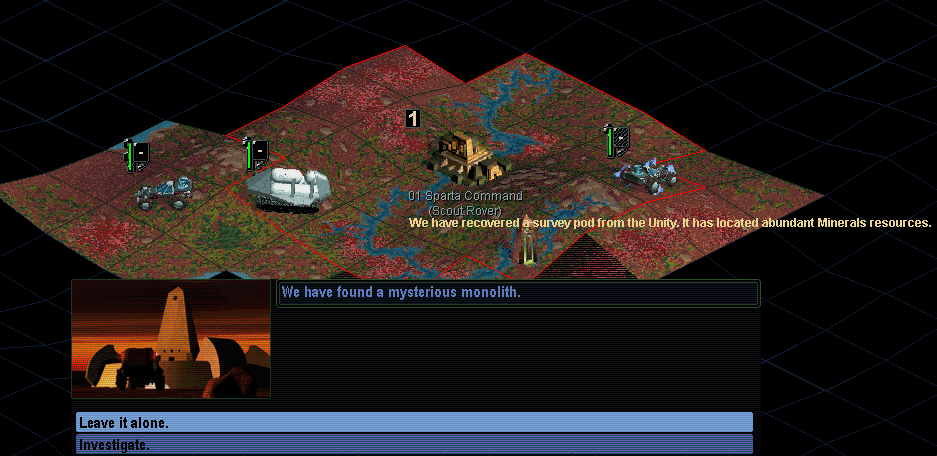 Turn 2, the river rover kept going to both of those pods. The first one turned up a monolith, which gives 2-2-2 resource yield. I alertly declined to investigate the monolith, which would upgrade the unit by one morale level, but that would end its movement for the turn. The next pod gave a minerals resource, nothing spectacular but certainly helpful, now Sparta Command has two excellent tiles to work.