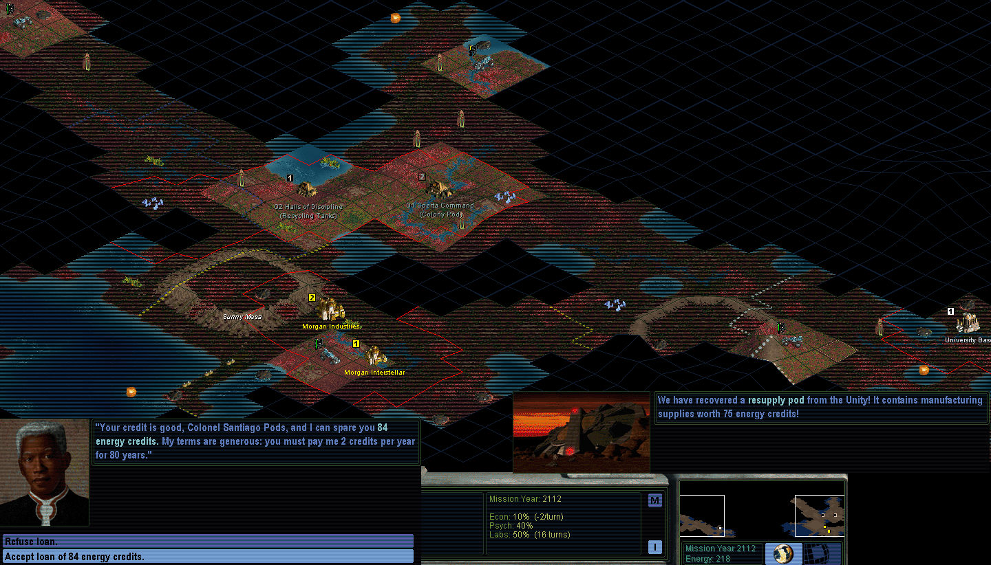 This is a writeup of a playthrough of Sid Meier's Alpha Centauri, with the Spartan Federation faction. This comes after several other games, in the order shown on the home menu here.