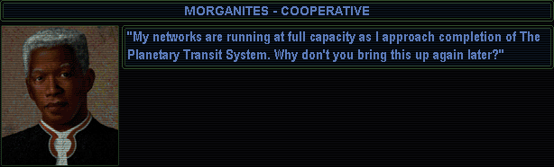 Morgan then declined any more trading for this reason, which surprised me, I haven't (at least recently) seen the AI decline a trade specifically because of a secret project. (His "approaching completion" wasn't true at all, infiltration showed that the base was 30+ turns away.)