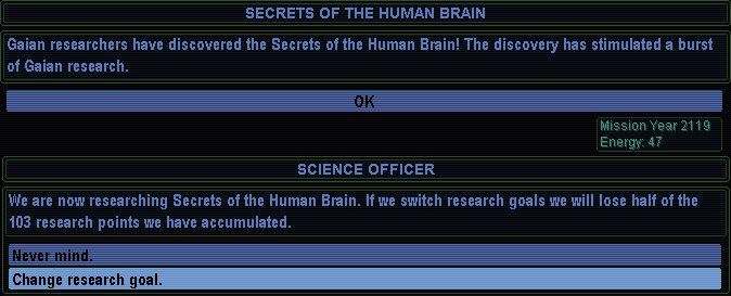 I then set my own research to Secrets of the Human Brain. It is on the beeline I need to the Cloning Vats (through Neural Grafting), so may as well pick up the free tech along the way. But...