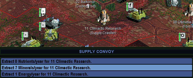 But this case is unusual. I've come to rely on supply crawlers less and less as this series of games has progressed, and this illustrates why. The value of a crawler is not the tile it is working, it is the value of the job the crawler displaces that laborer into, which is the next marginally-less-valuable tile or specialist job. 30 minerals for your next-worse tile just isn't as good as building more colony pods with the PTS to add three tiles including the base center square. In fact that crawler would be used into the PTS and then the base would just work the minerals normally once at size 3.