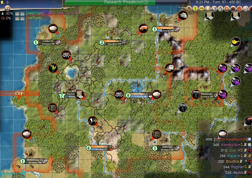 Hammurabi had founded Judaism, which spread by itself to no fewer than FIVE (!) of my cities, so I adopted that as well. There was no religious bloc developing anywhere - only Pacal had Buddhism and Boudica had Hinduism. So if I'm going to have only one friend by religion, I'm quite happy for it to be Hammurabi, letting me leave that border undefended and pacifying an aggressive leader.