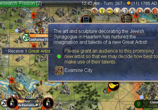 Yes, there's been a religion subplot going on here. I had acquired Judaism and Buddhism from my neighbors early on, conquered a Christian city, and self-founded Confucianism and Taoism. To maximize culture in 1900 AD, I need as many religious cathedrals as possible. I haven't actually built the cathedrals yet - making sure to avoid triggering a cultural victory before 1900 AD - but I've been laying the groundwork by spreading the faiths and building the temples. Any time a city didn't have anything else to build, it started training missionaries. (I'm still in Organized Religion for precisely that purpose.) Thank God Soren for that handy Auto-Spread button.