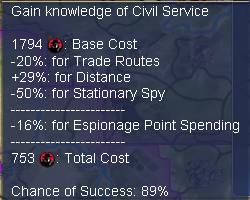 Anyway, I stole Metal Casting from Babylon. Traded for Code of Laws and Construction when they finally came available. Researched Compass via building Research and the Great Lib scientists. Then stole Civil Service from Babylon. I hadn't set out at all to do an espionage economy, and hadn't tried anything special to favor it (no Great Spies/Scotland Yards, or religious discounts) but it just worked anyway.