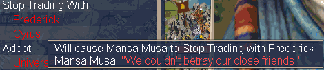 So now I canceled all my resource deals with Frederick, and sent all the resources at my disposal to Mansa, in hopes that I could get Mansa to grow his population ahead of Frederick.
