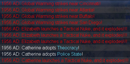 However, Elizabeth did slowly lose a few more cities, though. This was thanks to Catherine going before Elizabeth in the turn order, so Cathy got first crack at attacking any gifted nukes before Elizabeth could launch them. Also, after a while, Elizabeth even stopped using all the nukes.