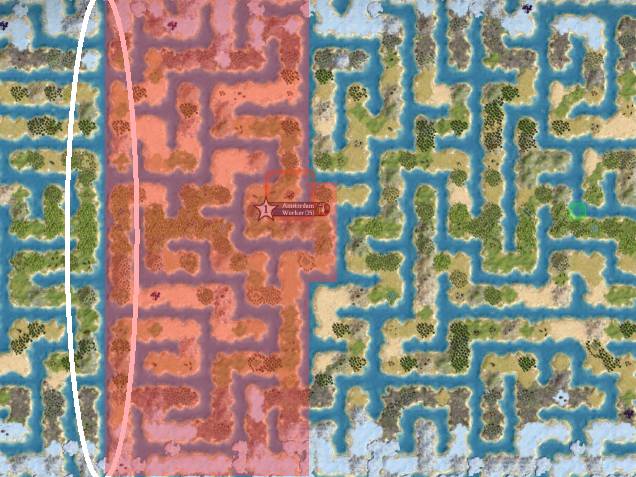 There's a key subtlety on the Maze map that I'm curious to see if players will notice. There's an "international date line" at the left/right edge of the map, a meridian of all water tiles with no land crossings. The AI simply won't cross this gap with cargo ships, it will always try to walk instead because the land is on the same continent, not considering that the walking would take up to a hundred turns. I intentionally sought and chose a map that placed the player with a "backyard" of uncontested land between him and this meridian to allow for healthy expansion room.