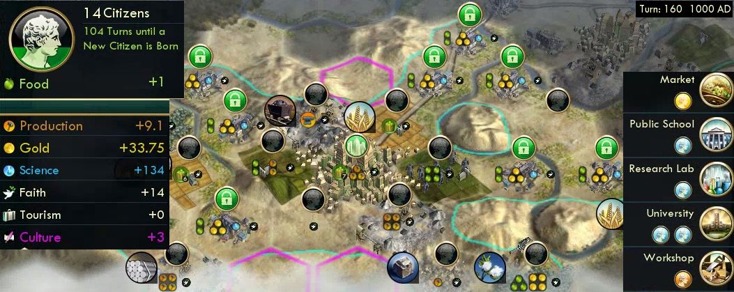 And so I got to Education with 1675 faith banked, 500 more than Poland had managed. This instantly bought 10 universities, where Poland had seven. It was two turns slower to reach Education than Poland, but the wider build may still turn out stronger by the end.