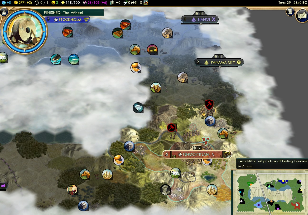 I looked down the list of civs, and found a new choice: Aztecs. As recommended by chumchu on Realms Beyond (again). Who informed me that the Floating Gardens UB is +15% to all food and not just the surplus. This actually does look perfect for Four-City Tradition. The kill-culture UA will help finish Tradition fast, and the aqueducts immediately multiply with the UB's food. The happiness engine will be Monarchy with what should be an enormous capital. And the endgame will be Freedom, since four cities can't build six spaceship parts with Order.