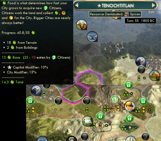 So Tenochtitlan built two settlers and bought one. I was feeling the pain of missing Collective Rule and the starvation loophole (had no hills). Each settler took 9-10 turns instead of 3-4, but at least we only had to build two. In the policy department, I took Monarchy (turn 37) ahead of Landed Elite (turn 54), since the latter doesn't help build settlers but the former would help buy one. (I always agonize over the decision to order those two policies, and then it doesn't matter as you just take both in sequence anyway.)