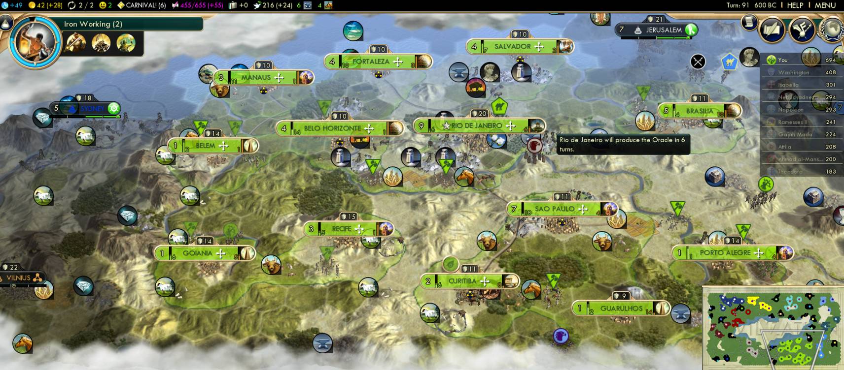 Wow, 13 cities by 600 BC. Yes, the max ICS Liberty plan is working well. At least out to the limits of my available land. I would add one more city in the far west, but other than that, there literally isn't any space for any more. I was kicking myself over the mistake of Porto Alegre's location. At 7 tiles distant from Brasilia, it blocks out that entire flood plains area, so sad to see that great river unused and unsettled. Porto Alegre really needed to be one more tile south to fit in one more city near that stone.