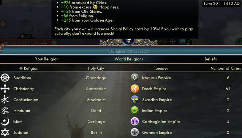 So my tech and production speed was just right. The cities slid smoothly from libraries to universities to opera houses. I wasn't falling several buildings behind, like when Napoleon built opera houses fifty turns after Acoustics. This worked because we weren't wasting time on colosseums, circuses, stone works. Definitely not shrines and temples. Those SUCK without Piety and are pretty lousy even with it. They don't produce enough faith, or rather other faith sources are too big. When you can get 16 faith from a city-state or 8 from a natural wonder or dozens with Desert Folklore, spending 140 or even 70 hammers for 3 or 5 faith is pretty terrible. I learned this the hard way in my France and Korea science games: DO NOT take shrine/temple dependent beliefs if not going Piety.