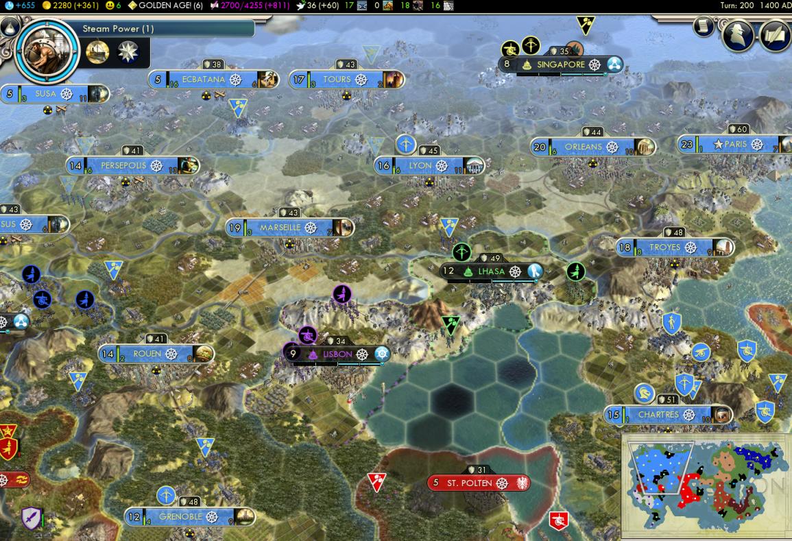 So SOH was great, but then, like, what do I do now? The whole empire is geared for research, over 1100 beakers/turn, but now there's nothing on the tech tree that matters for culture. The CN Tower might be mildly exciting, except that I'd already bought almost all the Broadcast Towers. Well, there was Railroad for Neuschwanstein for a bit of culture (for a lot of busywork on walls and castles) but that was about it.