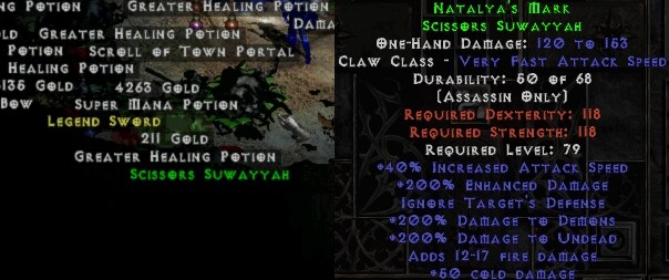 And then the Lower Kurast poppables struck again: Bartuc's claw came out of another ordinary stash. Nice find here; this claw isn't for Blade Fury (nothing for AR), but it's great to use off-hand, with skills and stats and hit recovery. As for the Blade Fury claw, though, then the following happened.