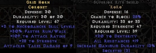 And for runes, I got zilch all, highest was two Ko which I put into the necro's shield. So I still have the two Guls unused, we'll see if I ever put those together into anything useful, would still need a Pul to make Heart of the Oak or Ist for Silence.