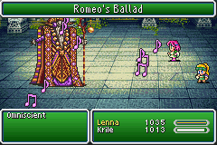 Anyway, how can two bards beat Omniscient without Hiding away his magic points? No song deals any direct magic damage. Apollo's Harp also counted as a physical attack (all weapons do) causing Omniscient to Reset the battle. Lenna and Krile could probably survive thanks to Regen replenishment until he ran out of magic points, but I had a better idea.