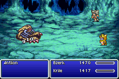 I was mildly worried about Antlion, as the single fight where I wouldn't have Faris the chaperone. Also I'd negligently left the Dancing Dagger on absent Lenna, removing Sullla's sometime tactic of repeating a fight until that weapon rolled enough Sword Dances. But Antlion went down easily anyway. He hit Bartz twice with Sonic Wave, but not Krile, who kept ripping off 1000 damage per attack. If there's one thing Berserkers do well, it's overcoming enemy defense with the berserk multiplier to attack.