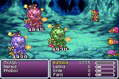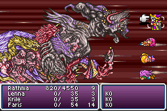 Then on Neo Exdeath, Rathma ran into a similar set of problems as Bone Mail engarbed Merlin. Without Elixirs, there's no reliable way to heal fully. Drain Touch would heal back somewhere over 1000 per turn, the same as Merlin could do with Venom Rods. That could just about keep up with the physical attacks and Almagests. But eventually Rathma would get killed exactly the same way Merlin would -- he couldn't kill the Grand Cross part quickly while spending all his turns on healing and the dice would eventually catch up.