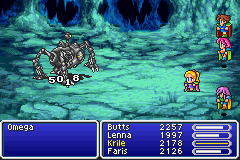 Fortunately, Faris alertly stopped Omega again with Romeo's Ballad. Lenna refreshed the Carbunkle walls. Bartz stopped him one last time... and Faris bounced one final Thundaga into Omega for the kill.