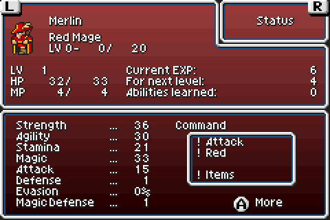 As we know, the Red Mage does everything adequately but nothing well. Halfway decent Strength, which makes him a somewhat capable melee attacker, which he'll need in the late game after the mid-level black elemental spells are no longer effective. Halfway decent Agility* and Magic Power too, though not up there with the thief or dedicated mage jobs. And very bad Stamina/Vitality, worse than even the black mage. Bartz is the right character same as for the Gladiator, to make up a little bit for the deficient Vitality stat.