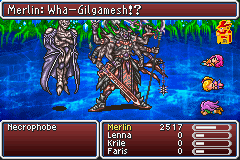 Merlin also invented a new solution to Omniscient. He is vulnerable to Berserk (via Power Staff) which shuts off his ability to Reset the fight when struck. His physical attack deals gargantuan damage though, nearly 2000 even in the back row -- but Merlin could handle that! Bone Mail defense and an Armor spell made sure Merlin could survive at least a couple rounds, long enough to inflict Aging status with the good old Ancient Sword, then break Venom Rods on the Bone Mail for healing.
