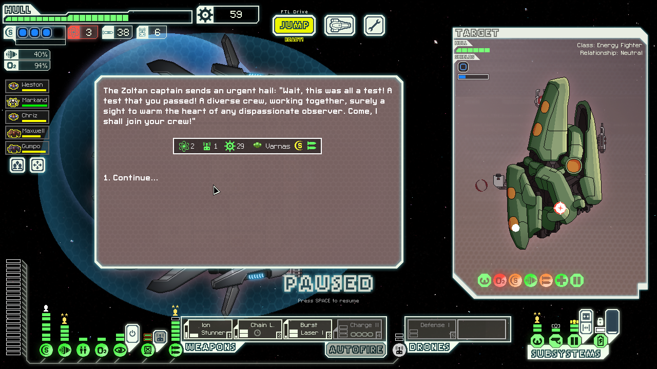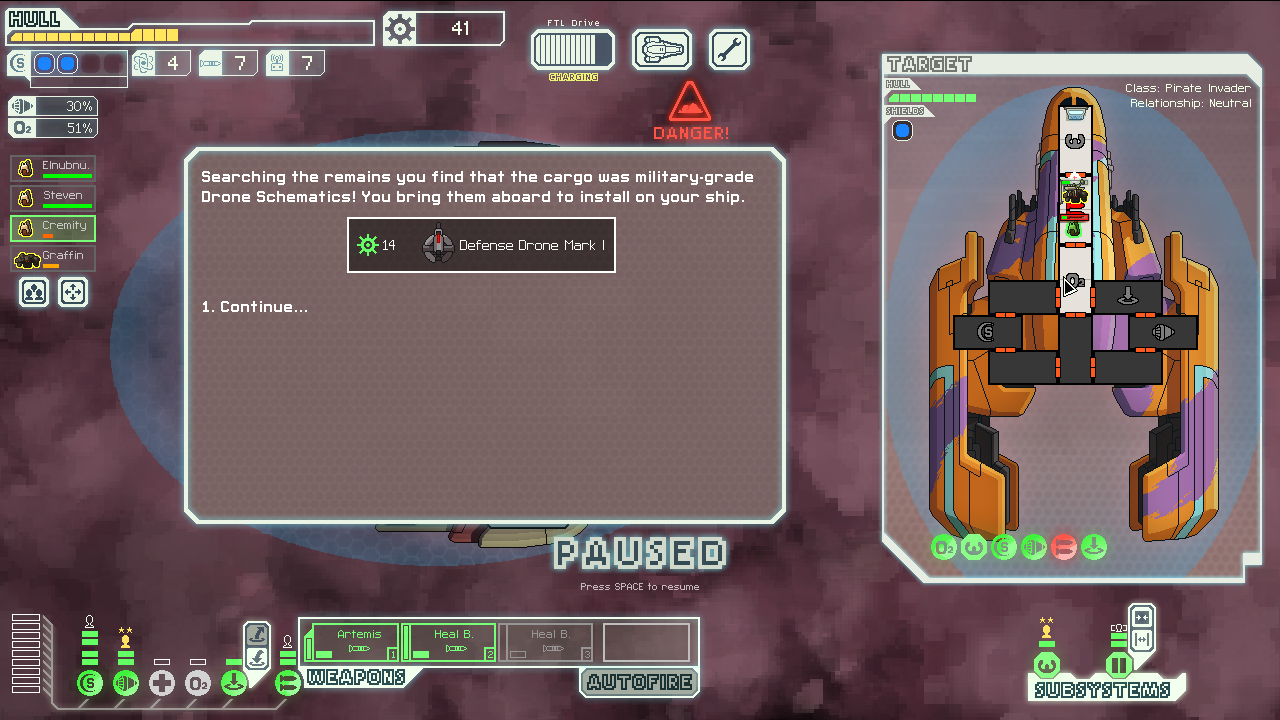 (still running just layer 2 shields and level 4 weapons.) Decided I was really glad I picked up drone control when I did, defense drone really got a workout in several fights, and the system repair drone was also critical in a few tough spots.