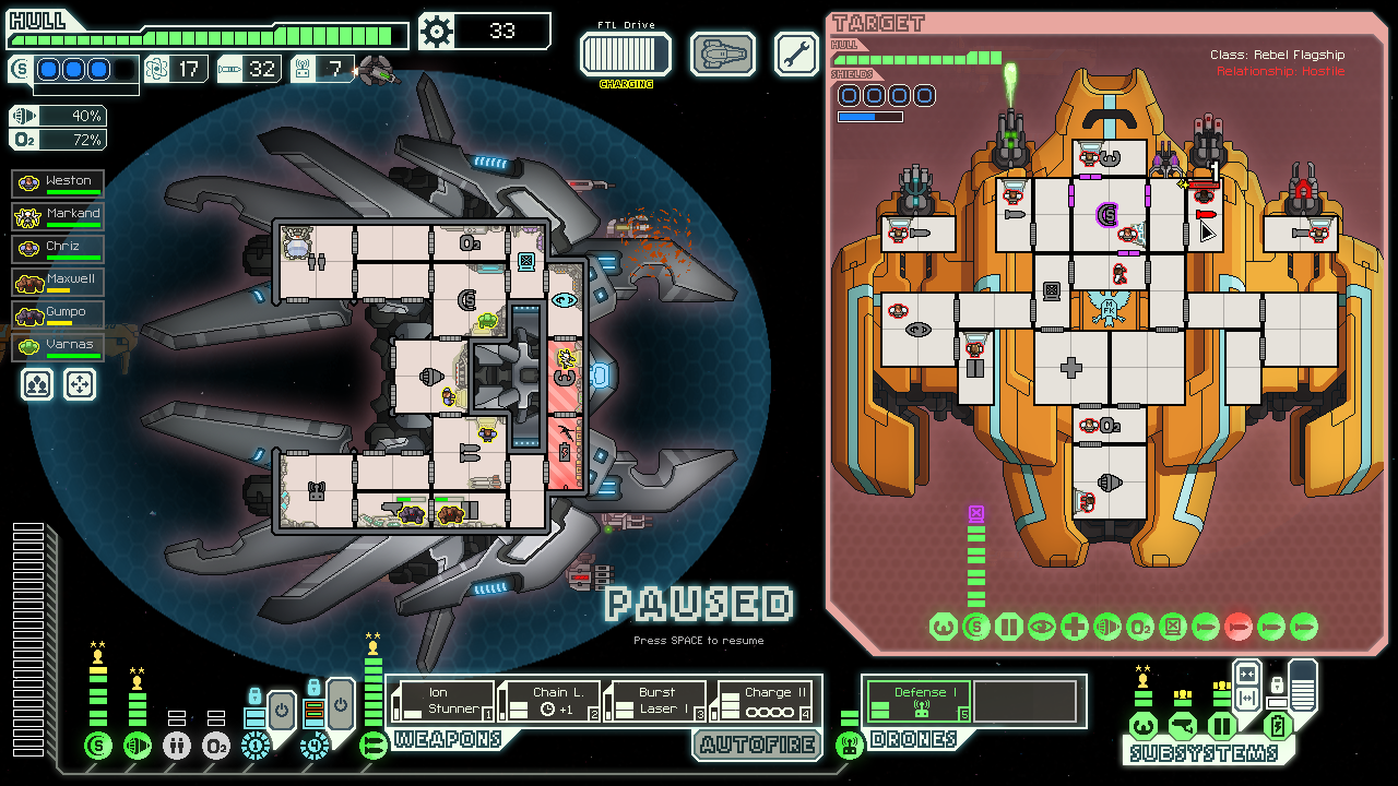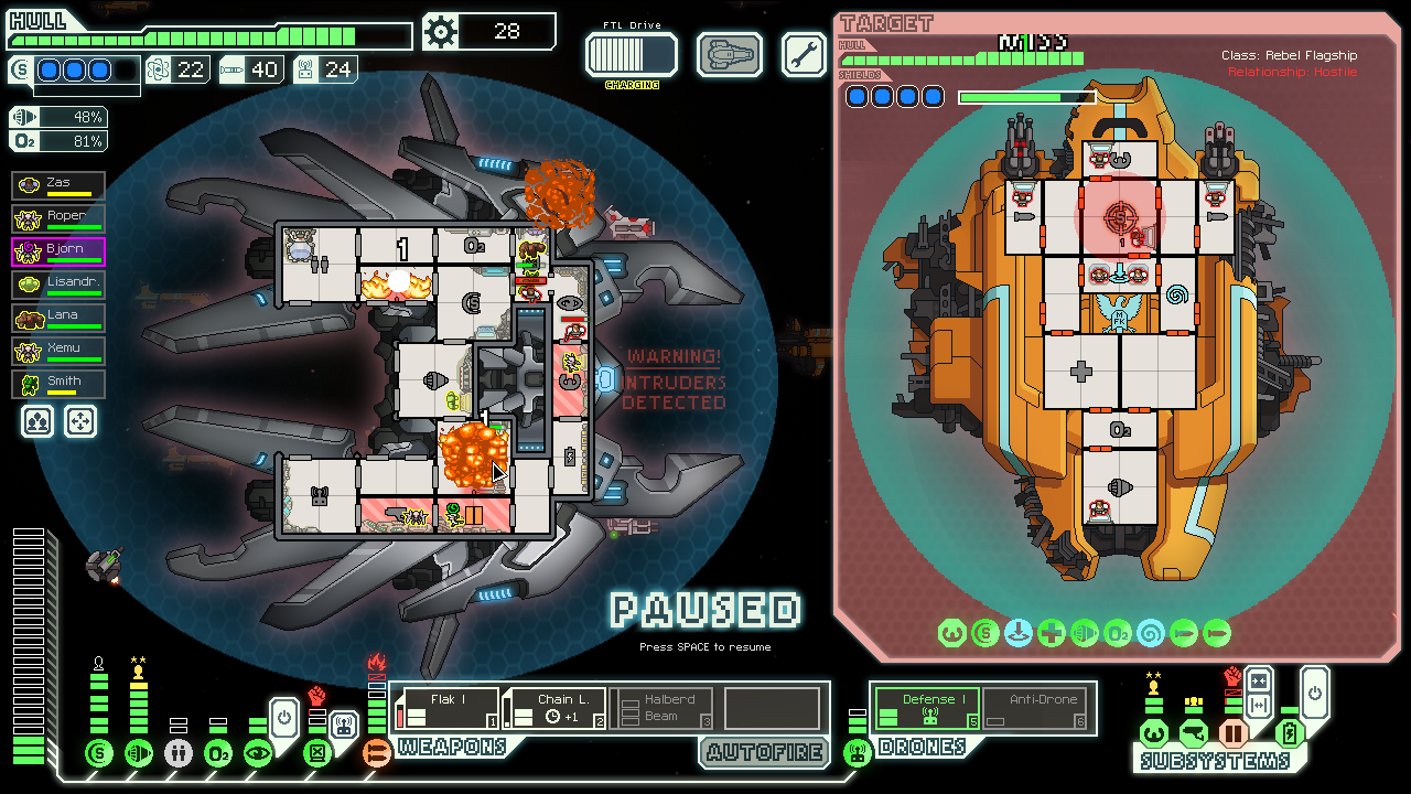 The flagship hacked my drones, but that wasn't a problem once I had the missiles breached and more than enough gas to keep them permanently offline. Then I finally breached shields to speed up the flak actually making the kill. This was brutally satisfying, one of the best fights I've ever had by any measure.