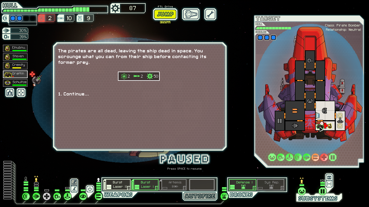 and finally got shields layer 3 with that, then weapons to 5 to use Burst 2 + Burst 1 + Artemis all together. Winning fights still took a LOT of work, micromanagement with crew and to shoot out weapons and med bays, I had a LOT (like dozens) of fights where I rode my crew right down to the edge of disaster on single digit health. Crew was still the hurting point, now I actually wanted to buy some but the stores didn't have any, then finally encountered the slaver I needed.