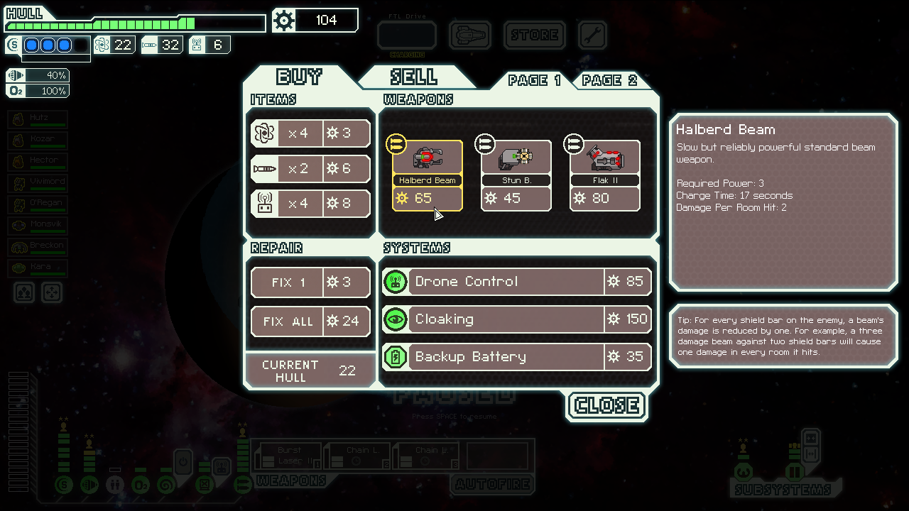 (we only get one pick out of hacking/cloaking/drones which means cloaking.) Held off on first 50 scrap to shields because there was a store in view - hoped for cloaking and there it is with enough scrap