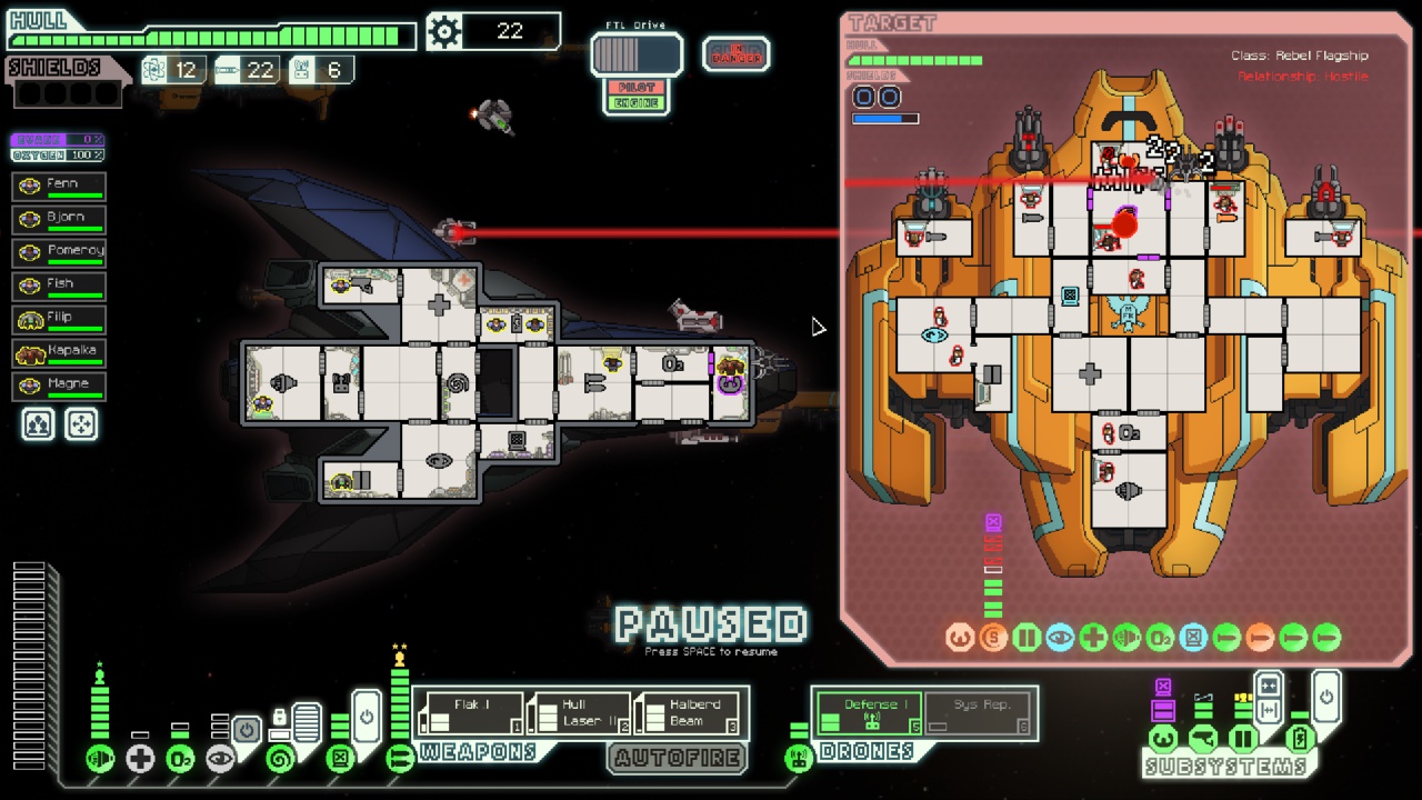 The Mini Beam is fantastic too, but doesn't quite have enough punch in the later sectors and takes just a bit too long to kill. It's the most damage/power/time efficient weapon in the game, but just 1 damage across weapons and shields isn't enough to cripple an enemy ship. That second damage from the Halberd makes a big difference, always taking out one shield bubble and a weapon, buying time for that second stroke to kill.