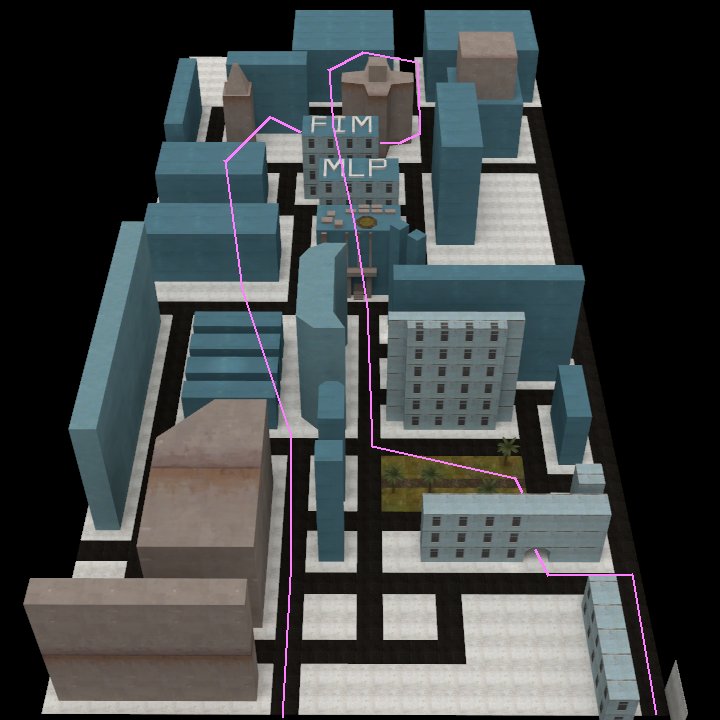 Source Filmmaker: The biggest chunk of work here was mapping out Second Reality's city and recreating it in Valve's Hammer level editor. I approximated the colors of the original buildings, using textures for a richer look rather than flat colors. The pony animations are pretty standard SFM modeling stuff, I don't have anything to say there that you wouldn't find in other tutorials online. One detail is a spotlight that hovers above Twilight and moves with her, to create that rich glossy lighting look.