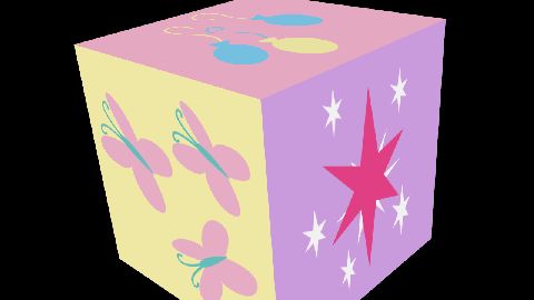 Hey, it's a cube. This idea came almost directly from Dork. The obvious thing to put on a six-sided cube is the six cutie marks. I was a bit worried about overly ripping off Dork with cutie mark animation, but turned out I didn't use cutie marks anywhere else in the show so this one segment was okay. I considered also adding a plasma wave texture like Second Reality has on the cube, but my friend pjabrony acting as creative consultant said that just the animated cutie marks were enough to carry the scene.